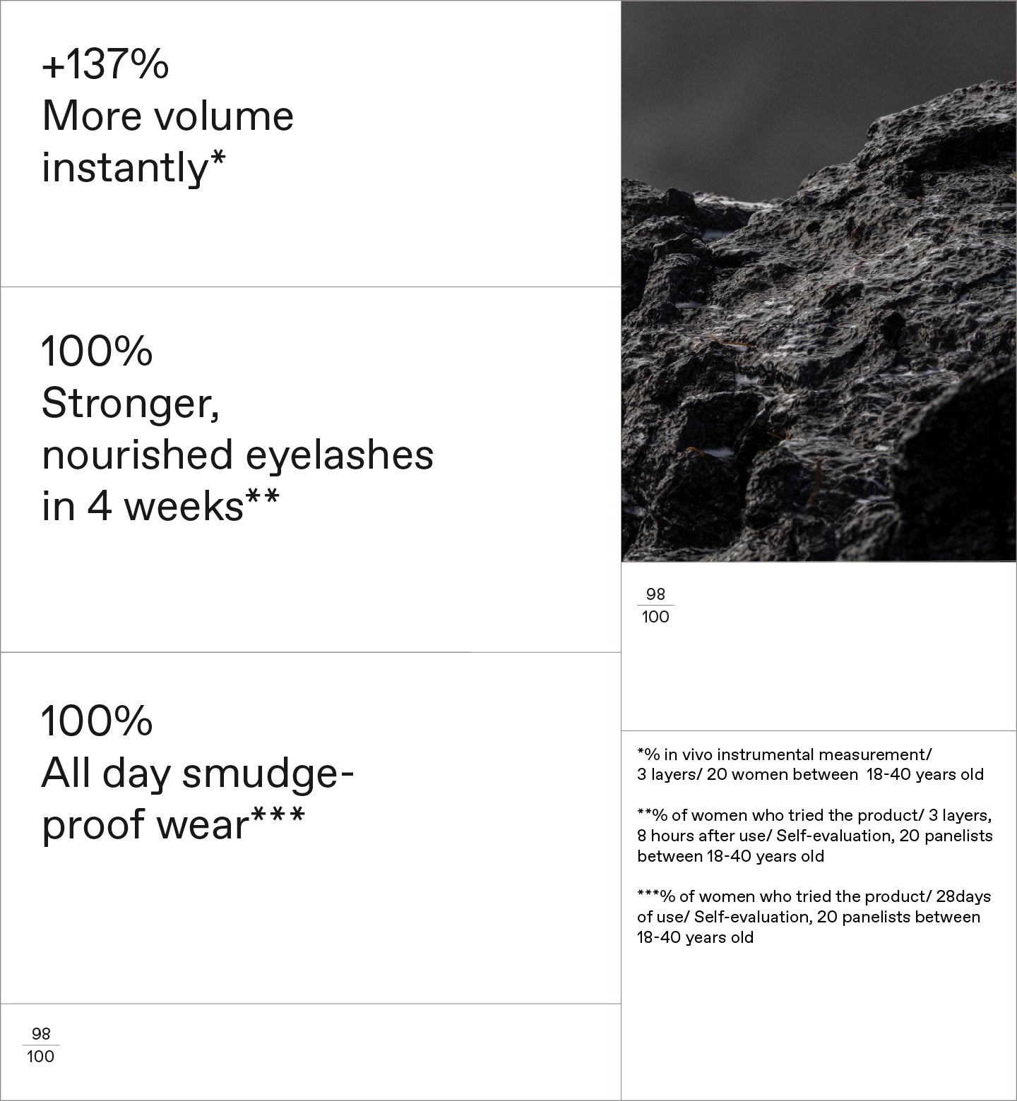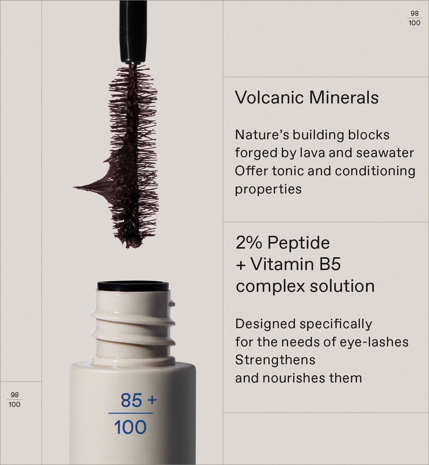 A volumizing mascara that creates longer, denser eyelashes for impressive, dramatic looks. The dense brush coats every lash for rich color, extreme volume, and length to give a multidimensional result. With Volcanic Minerals and a Vitamin and Peptide complex, it strengthens and nourishes the eyelashes.