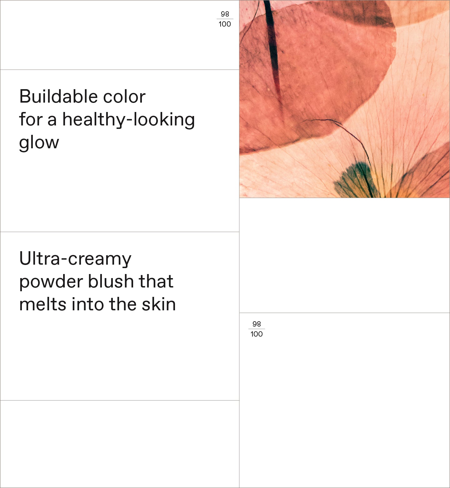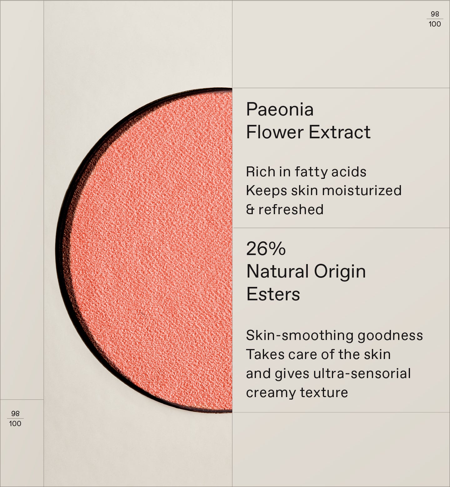 An ultra-creamy powder blush with a velvety texture, infused with Peony Flower Extract and Natural Origin Esters. Offers a buildable finish for a naturally radiant, healthy-looking glow.