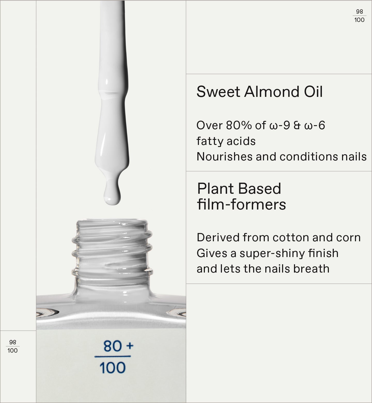 A high-naturality nail polish that offers a chip-resistant, high-shine result. Infused with Sweet Almond Oil and Plant-based Film-formers, it is a natural alternative to traditional nail polishes, without compromising results.