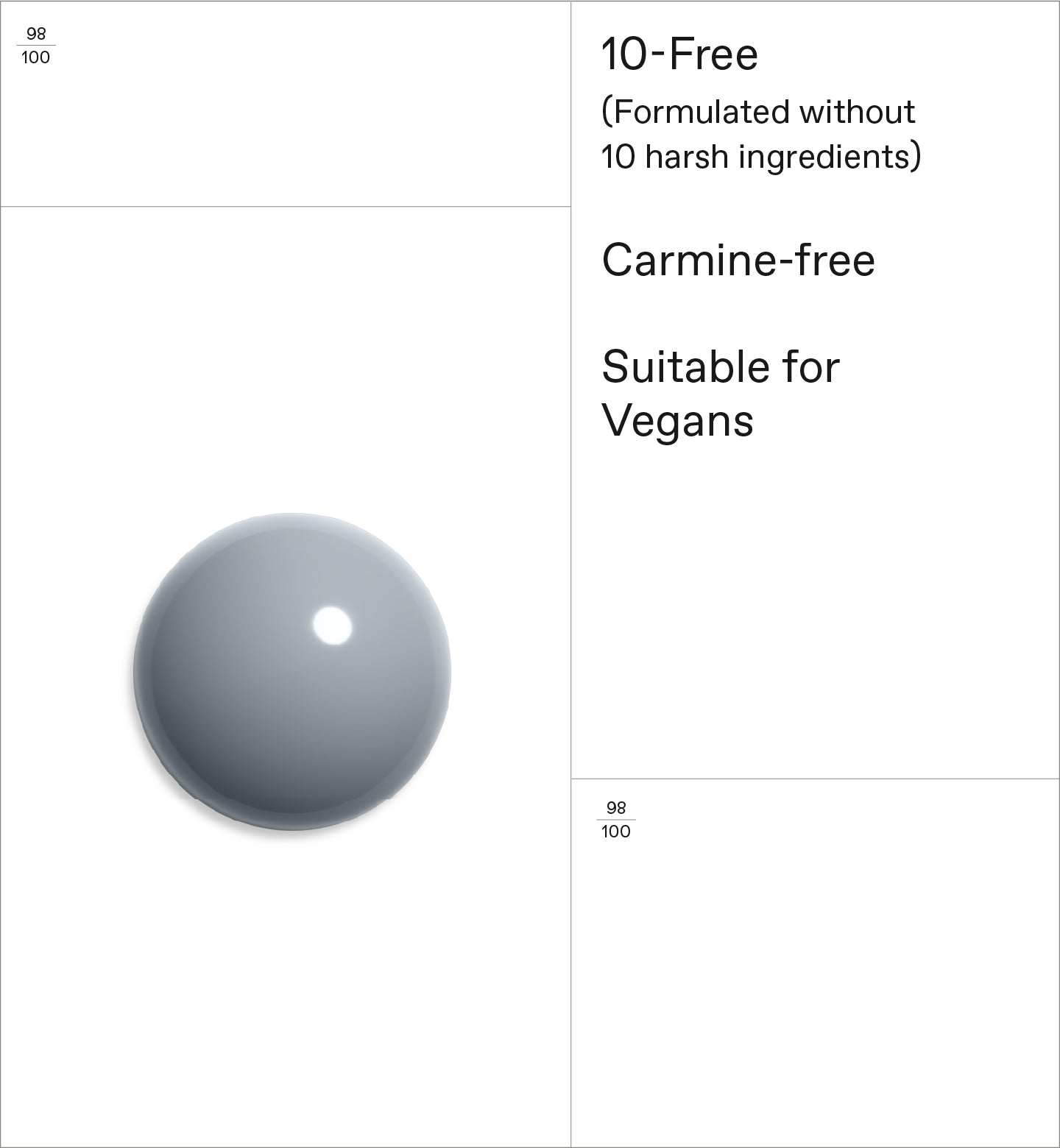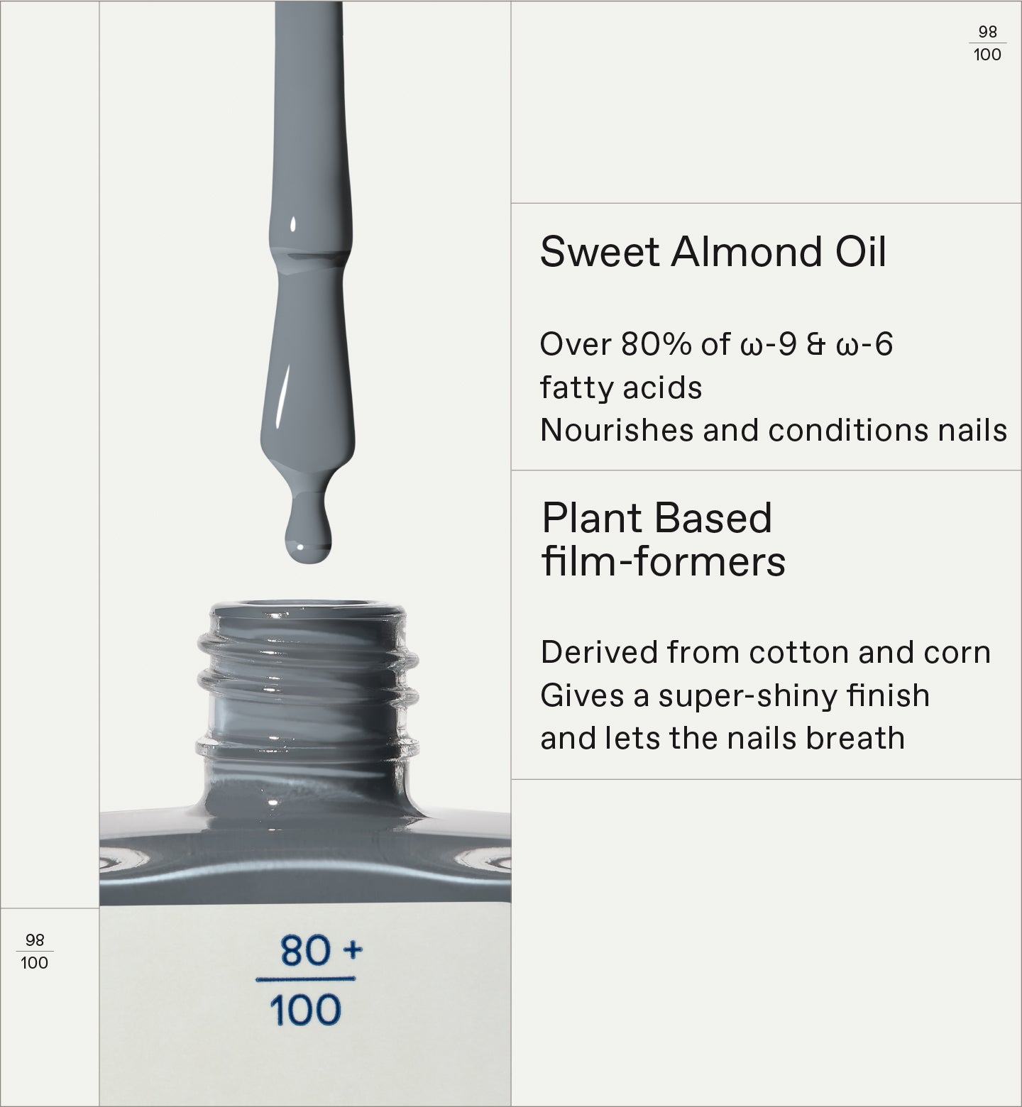 A high-naturality nail polish that offers a chip-resistant, high-shine result. Infused with Sweet Almond Oil and Plant-based Film-formers, it is a natural alternative to traditional nail polishes, without compromising results.
