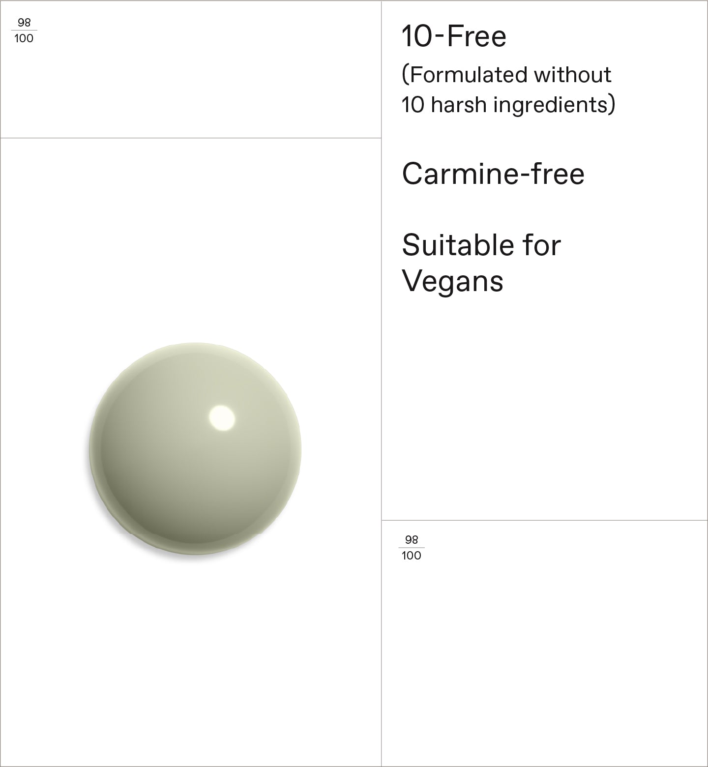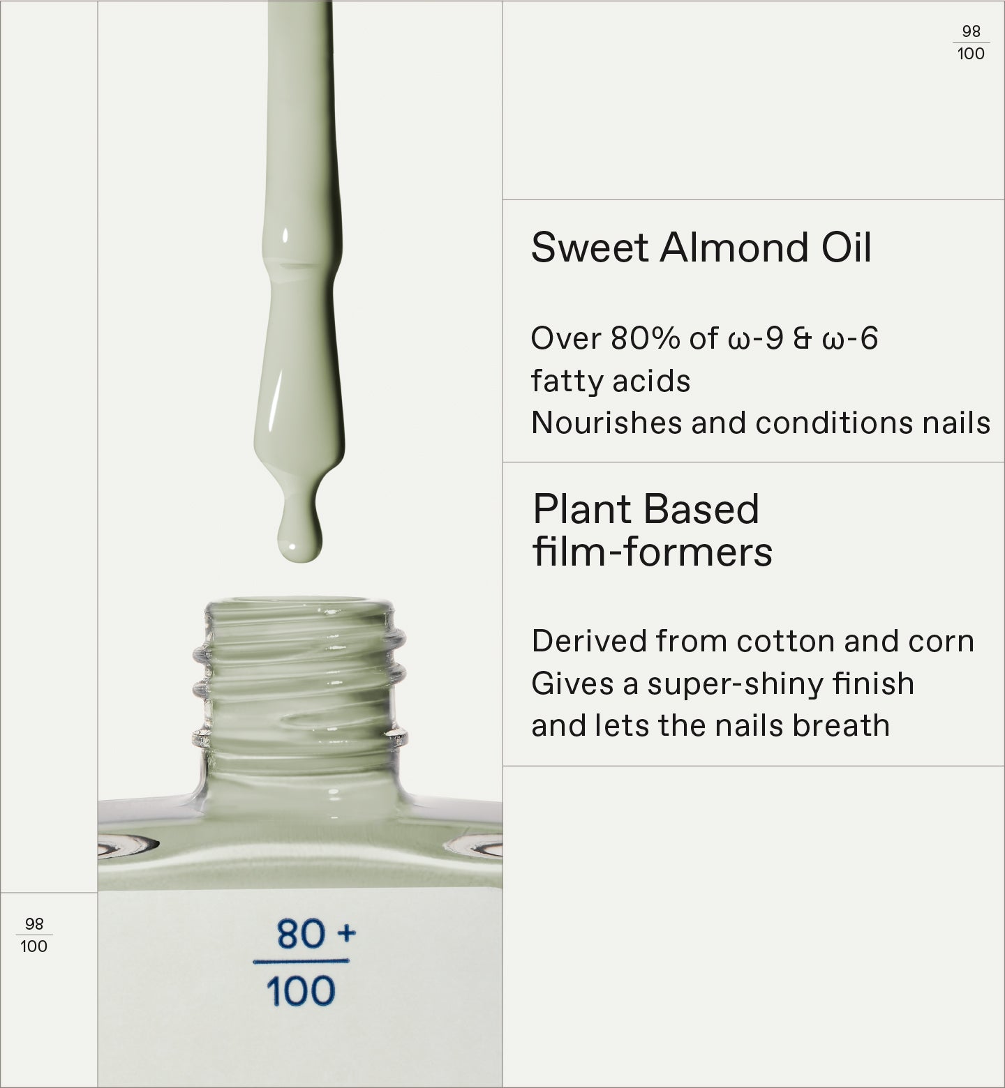 A high-naturality nail polish that offers a chip-resistant, high-shine result. Infused with Sweet Almond Oil and Plant-based Film-formers, it is a natural alternative to traditional nail polishes, without compromising results.