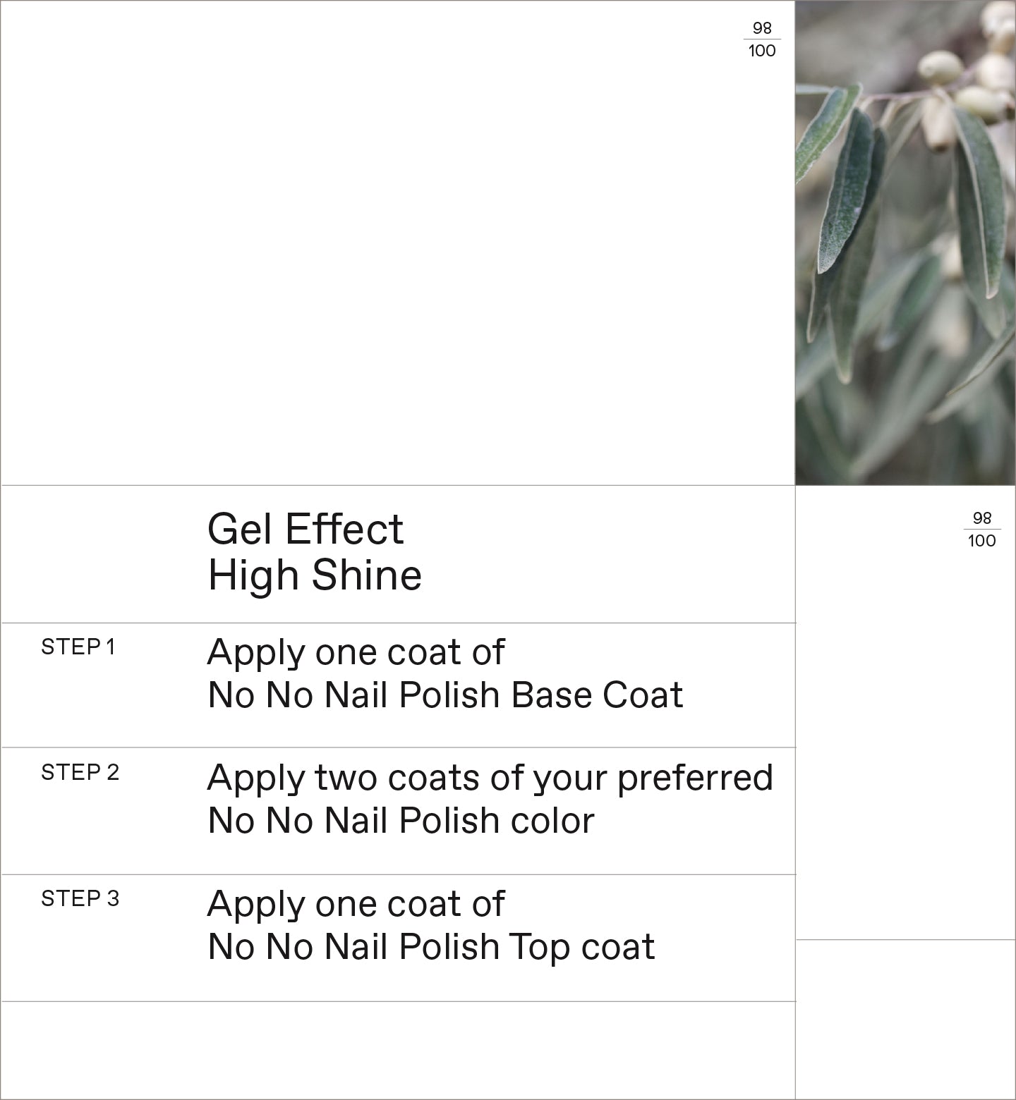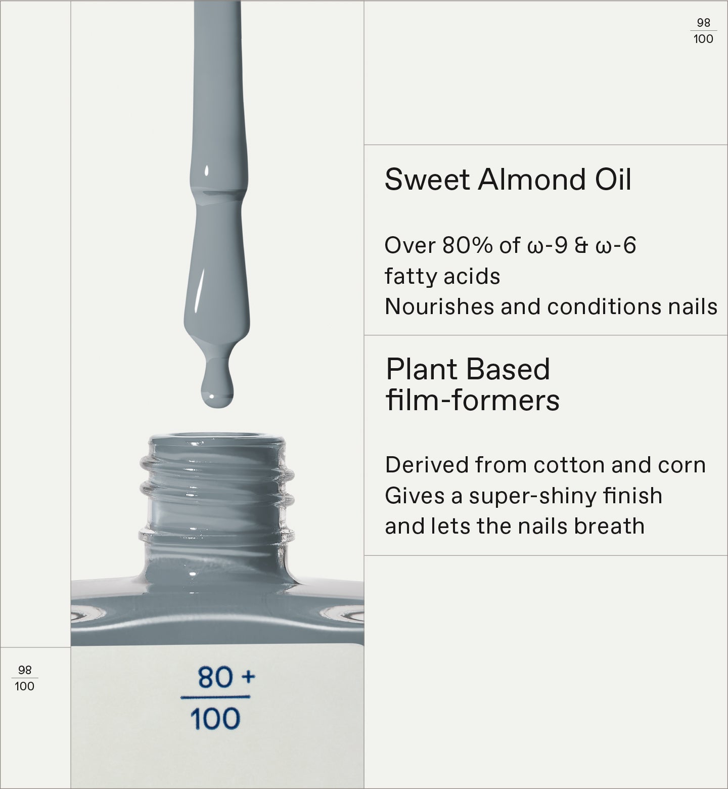 A high-naturality nail polish that offers a chip-resistant, high-shine result. Infused with Sweet Almond Oil and Plant-based Film-formers, it is a natural alternative to traditional nail polishes, without compromising results.