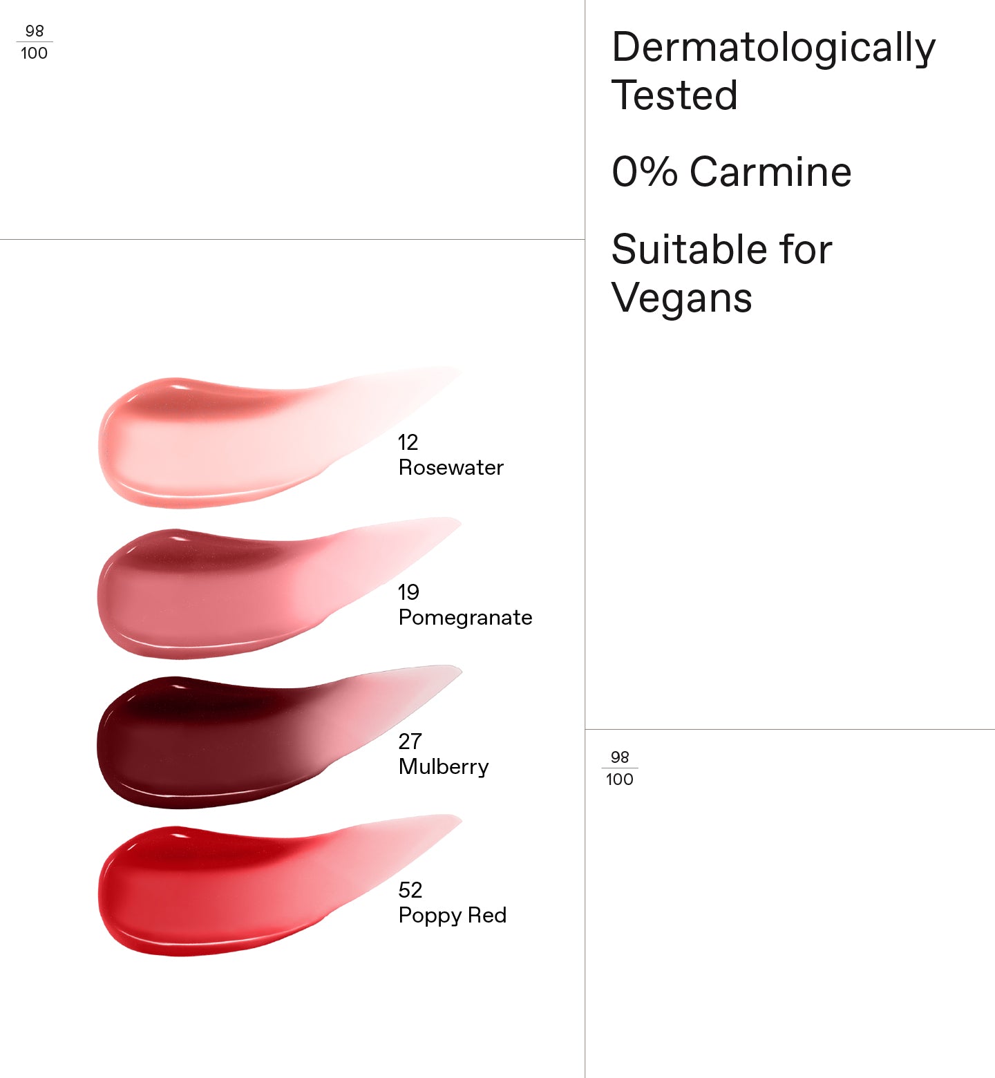 A lip shine with a gloss-meets-balm formula offering a non-sticky wash of color and a true, high-shine finish. With Pomegranate Flower Extract and Castor Oil, for dewy comfort and balmy hydration.