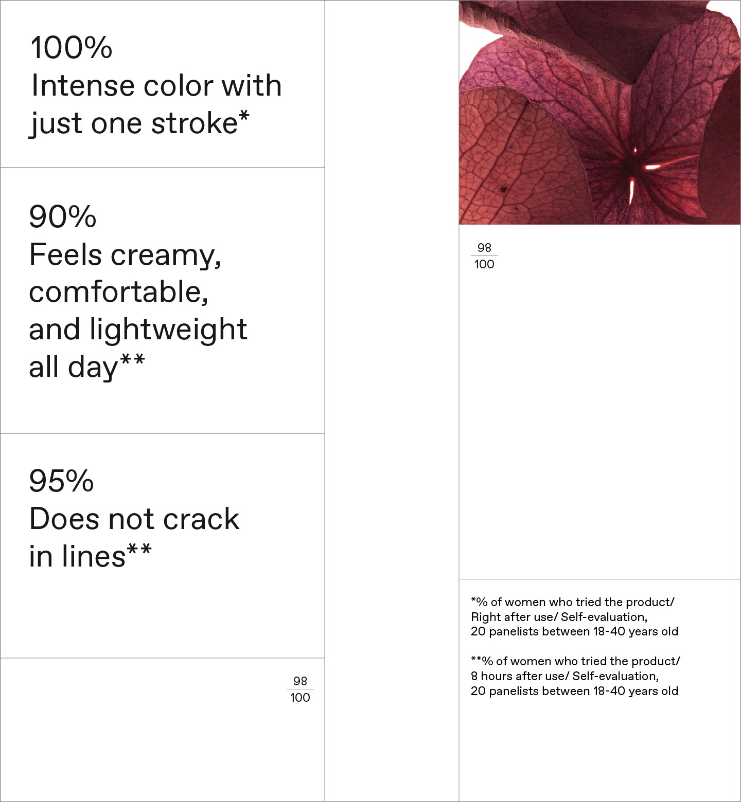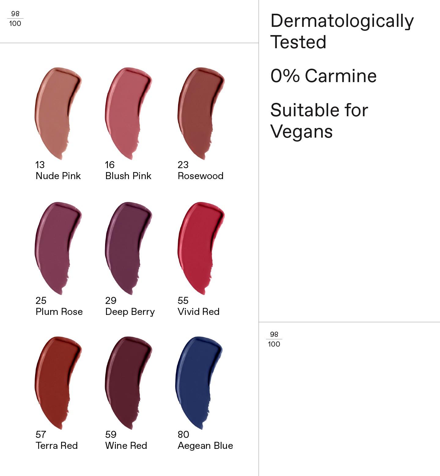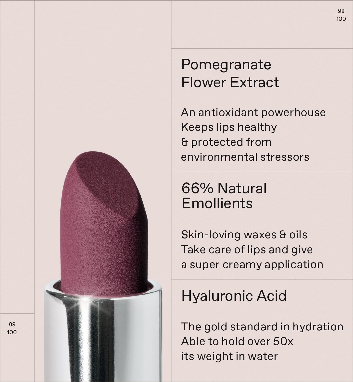 A semi-matte lipstick with a creamy texture and high-coverage color in just one stroke. The color feels lightweight all day, while it does not crack in lines. Infused with Pomegranate Flower Extract, Natural Emollients, and Hyaluronic Acid for comfortable wear and smooth, soft lips.