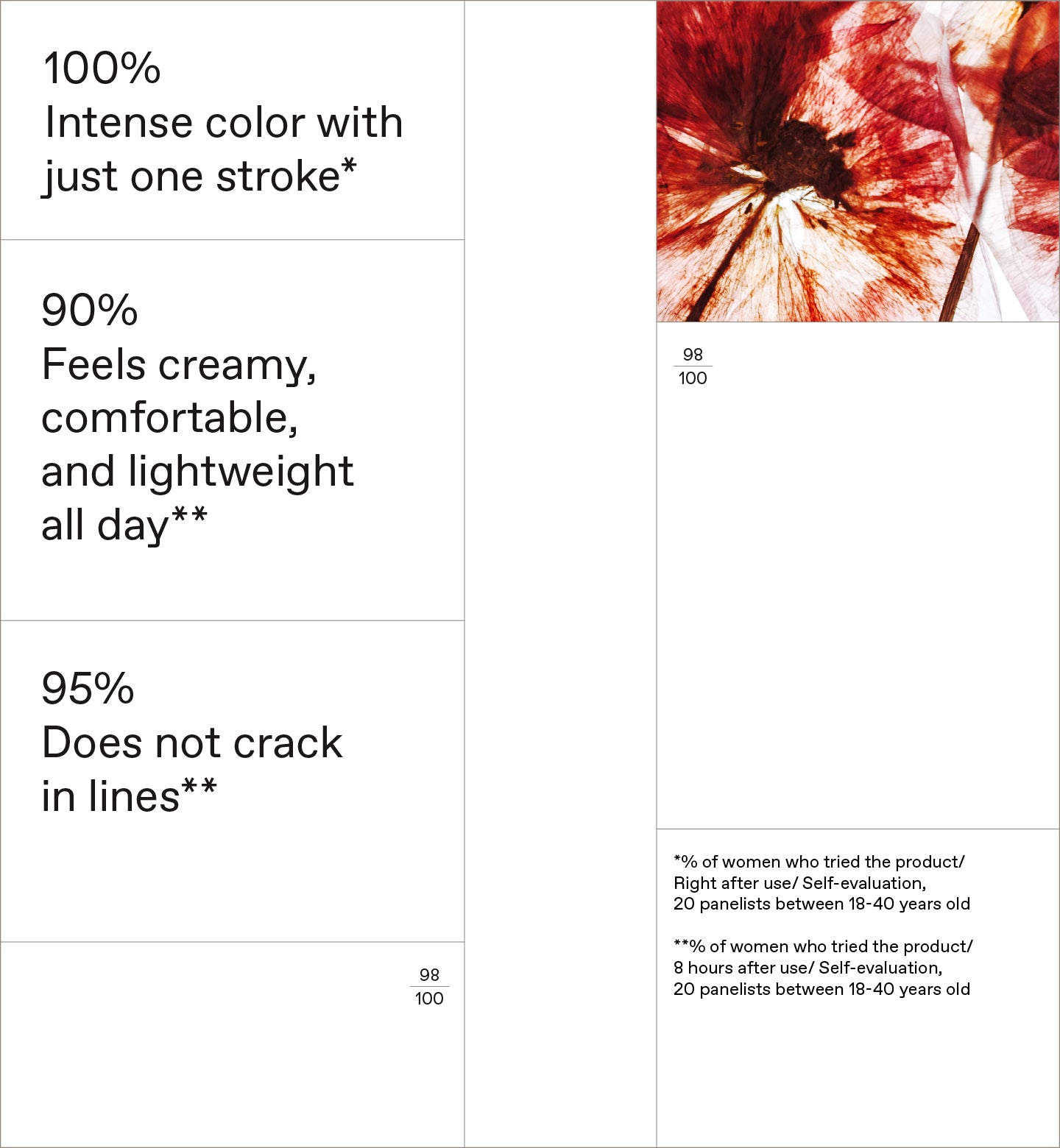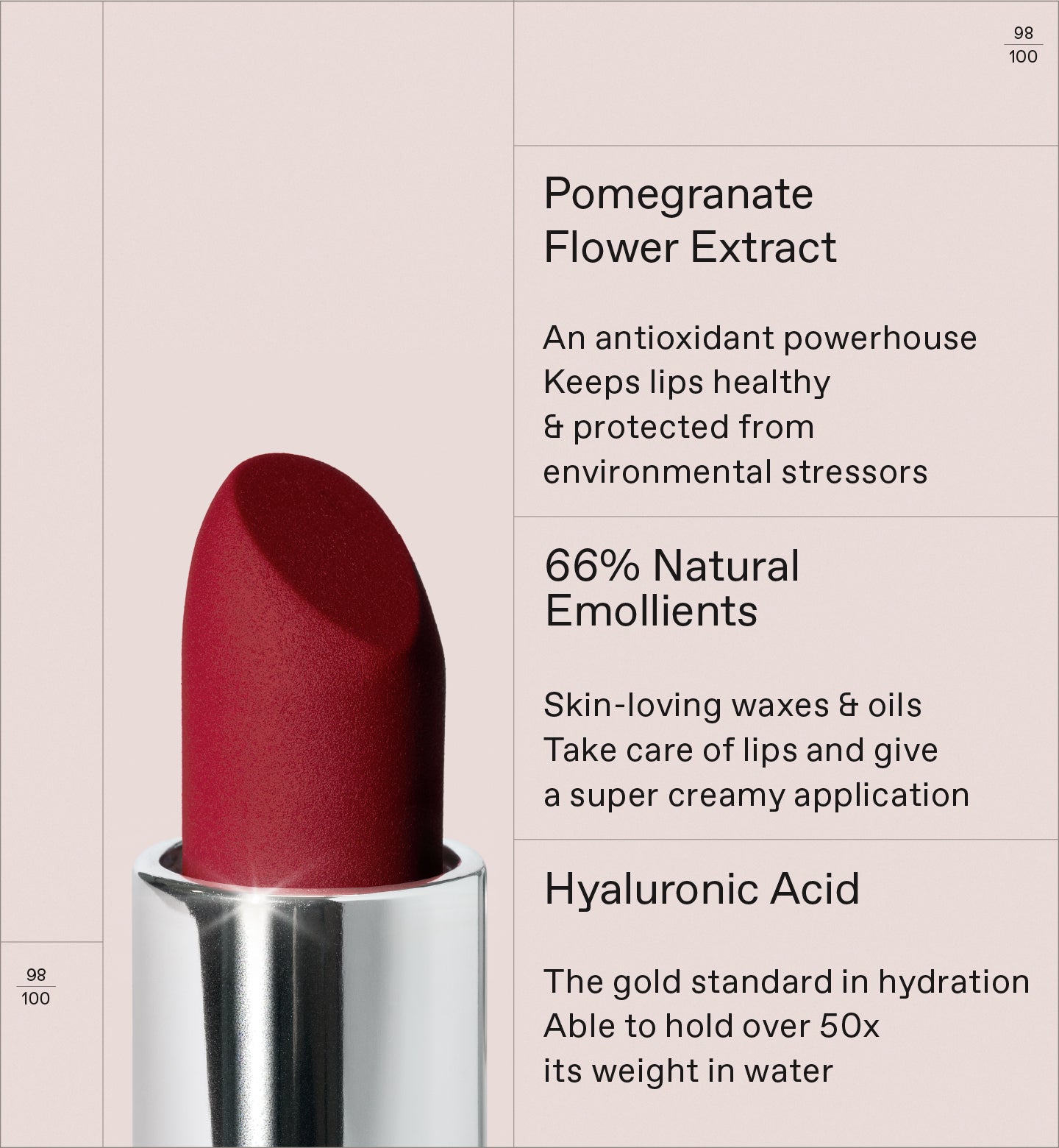 A semi-matte lipstick with a creamy texture and high-coverage color in just one stroke. The color feels lightweight all day, while it does not crack in lines. Infused with Pomegranate Flower Extract, Natural Emollients, and Hyaluronic Acid for comfortable wear and smooth, soft lips.